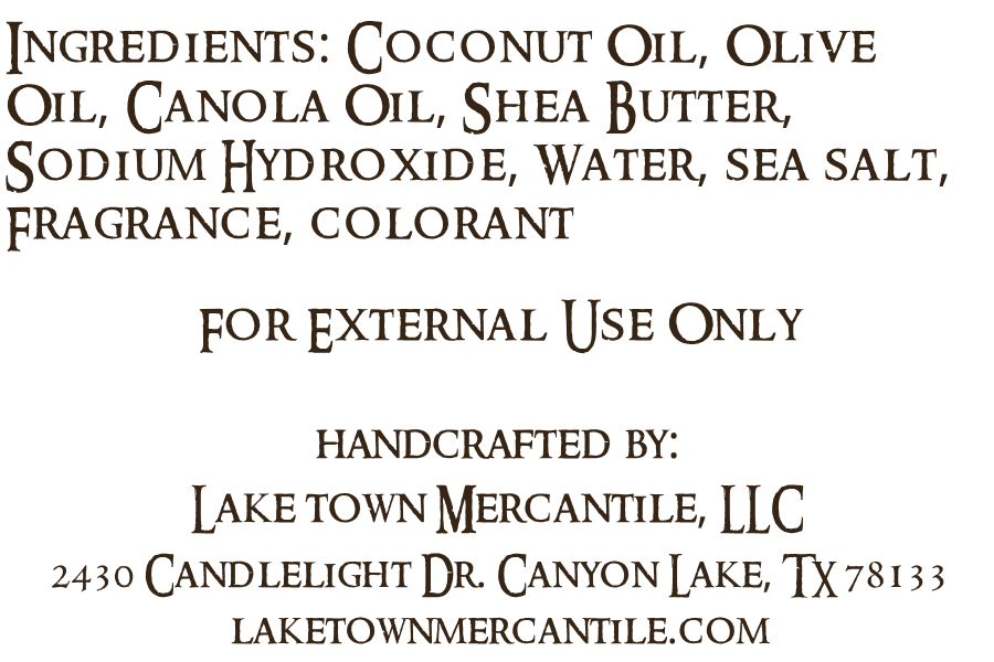 Ingredients: Coconut Oil, Olive Oil, Canola Oil, Shea Butter, Sodium Hydroxide, Water, Sea Salt, Fragrance, Colorant